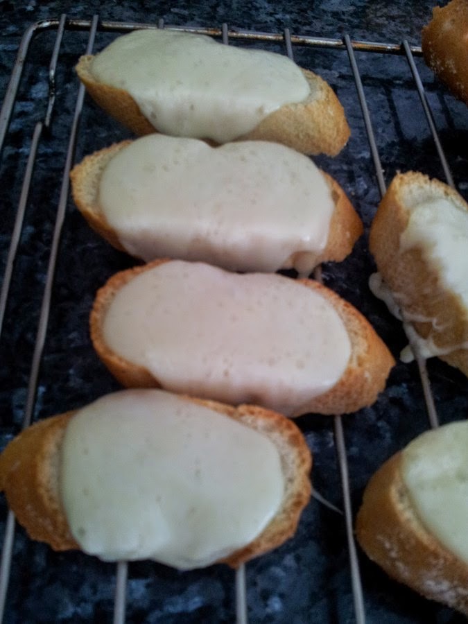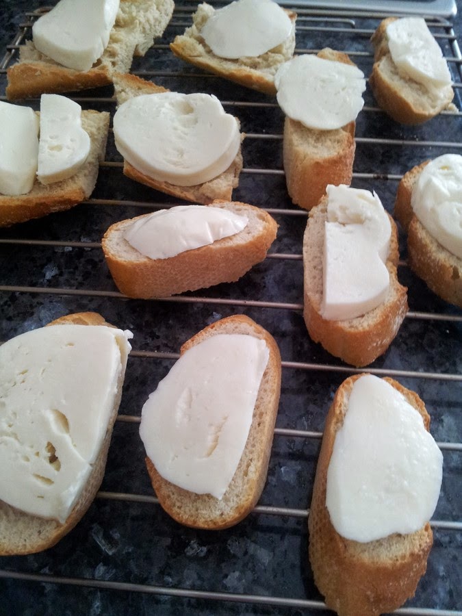 Tostar ligeramente las rebanadas de pan, alinearlas sobre una bandeja de metal, tipo rejilla, cubrirlas con las lonchas de mozzarella y meterlas al horno precalentado a 200º C dejar en el horno unos 10 minutos, hasta que la mozzarella esté totalmente fundida.