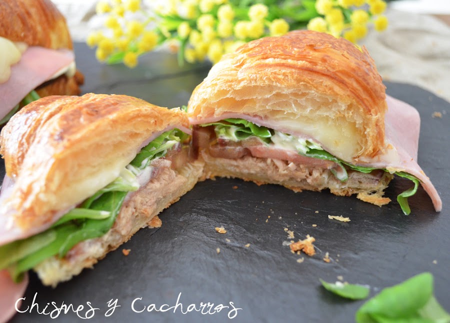 Tan sencillo como abrir los dos cruasans. Poner en la tapa de abajo una capa de mayonesa, encima el atún y dos rodajas de tomate. Encima los canónigos luego el jamón york y por último el queso.
