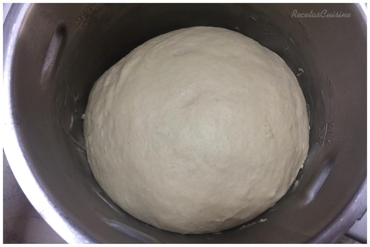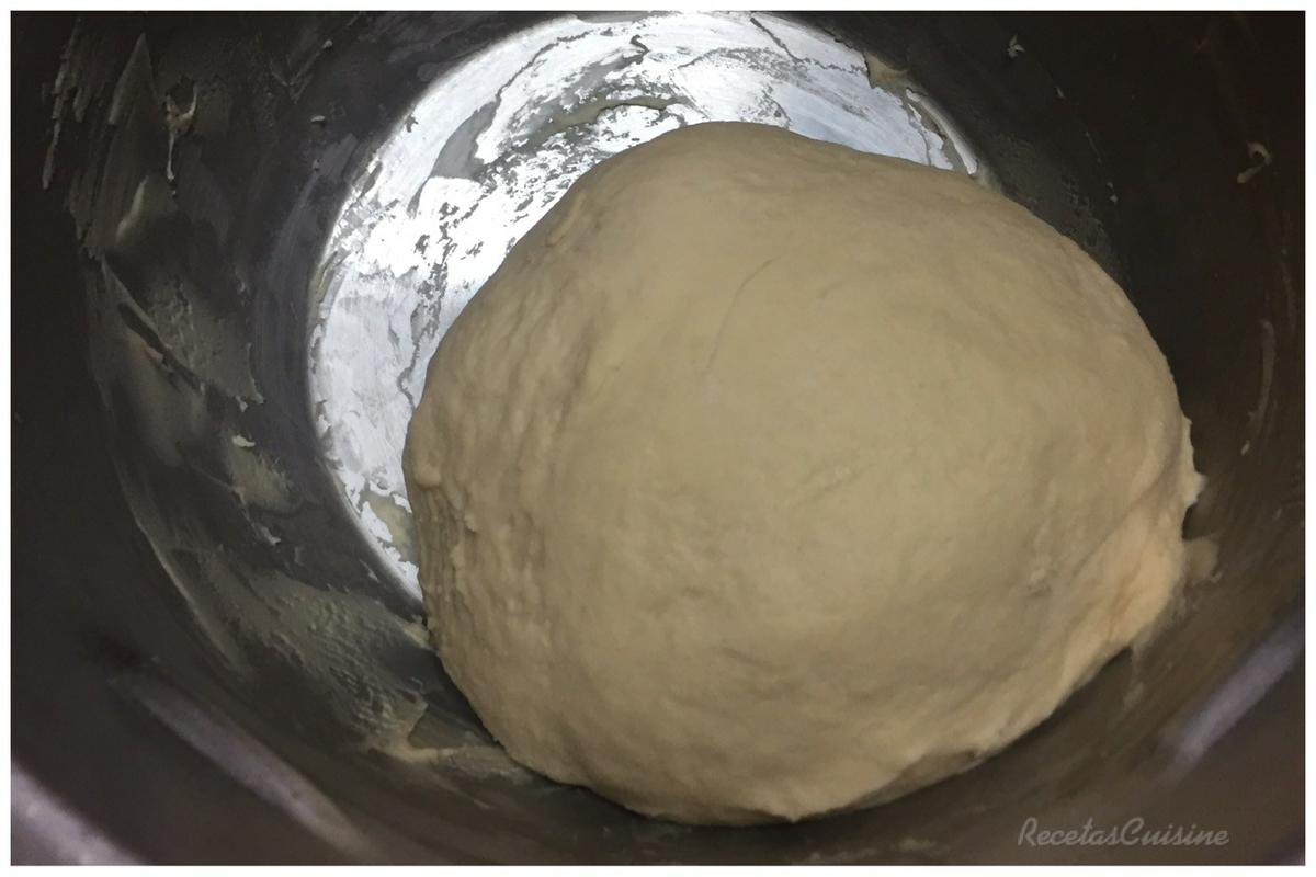 4. Después de este tiempo de reposo, sacamos la masa del bol y la colocamos en nuestra superficie de trabajo que tendremos ligeramente enharinada. Amasamos durante un minuto aprox. para que la masa suelte el aire que ha adquirido al fermentar.