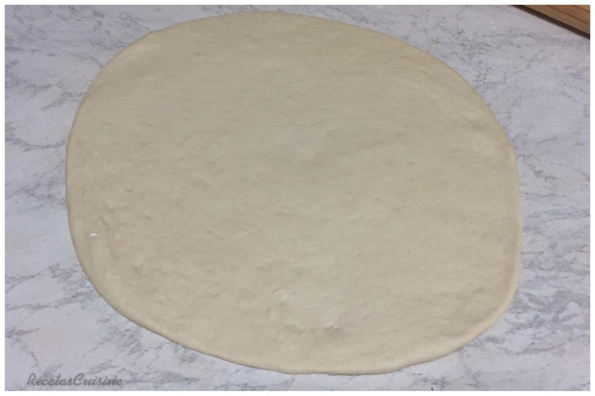 5. Dividimos la masa en dos partes iguales (si queremos hacer cruasanes más pequeños, en plan aperitivo, podemos dividir en tres partes, según el tamaño que nos interese darles). Estiramos cada parte con el rodillo y damos forma de círculo, intentaremos que nos quede lo más simétrico posible y con un grosor aproximado de 2mm.
