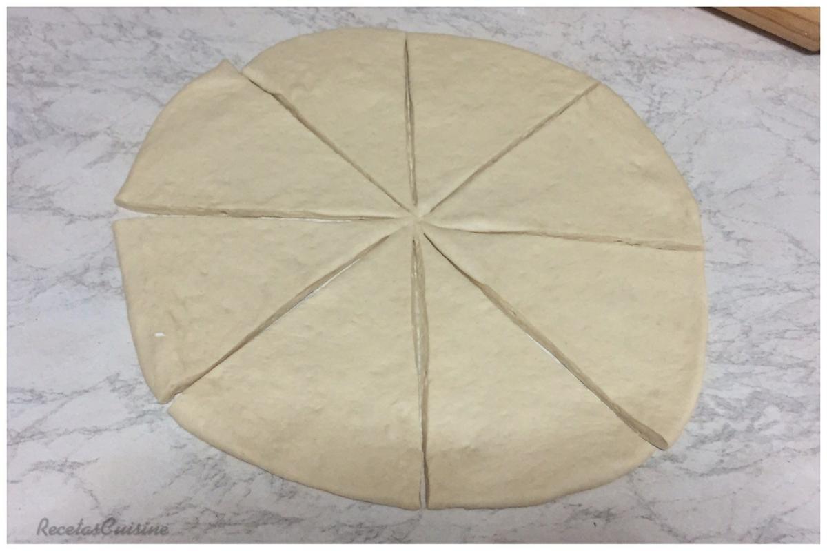6. Con un cuchillo bien afilado, cortamos cada círculo por la mitad horizontalmente, después verticalmente, y luego en diagonal hasta que nos queden ocho triángulos del mismo tamaño aprox.