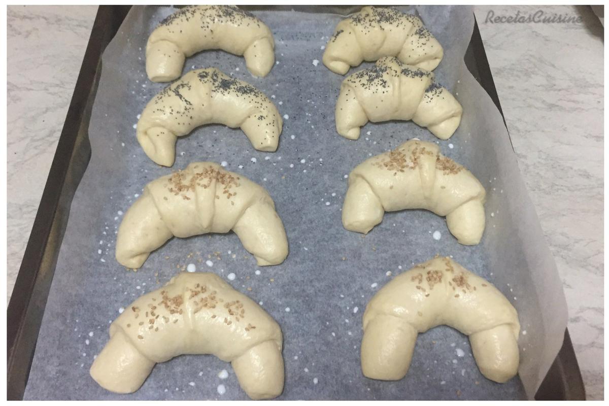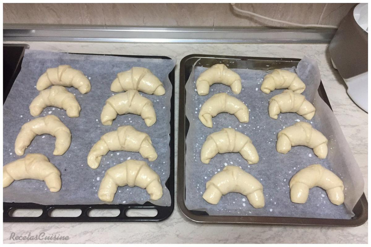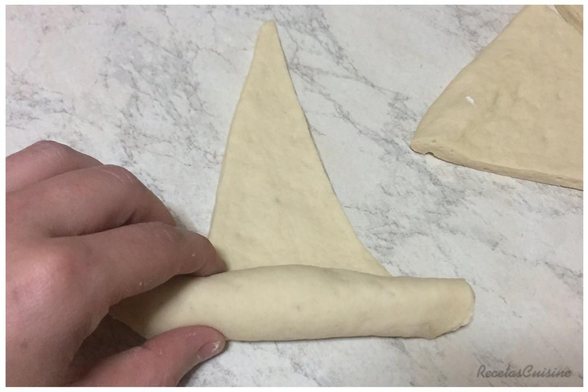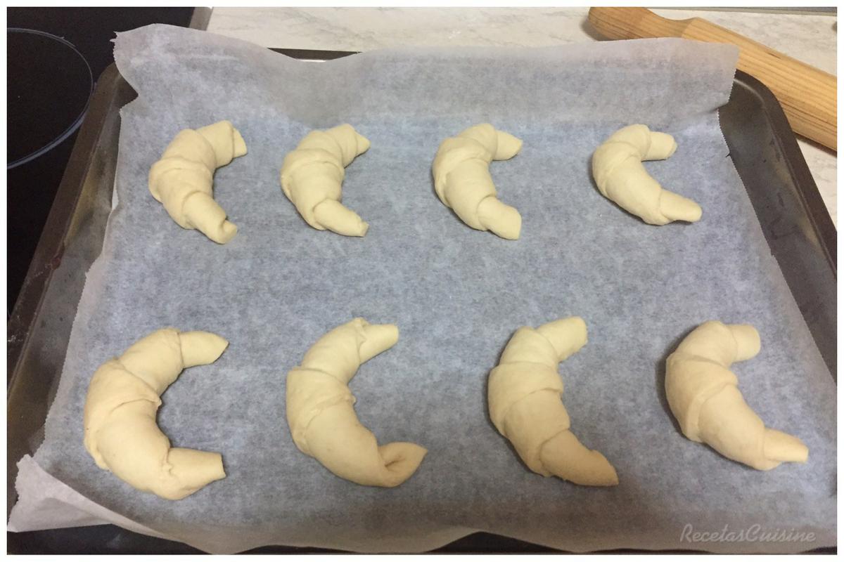7. A continuación, para hacer la forma de cruasán, cogemos cada triangulo y lo enrollamos desde la forma más ancha hasta la punta. Los vamos colocando en la bandeja del horno, sobre papel de hornear y dejando un espacio entre ellos, puesto que crecerán y de no dejar esta separación, podrían juntarse. Metemos las puntas un poquito hacia dentro, si queremos que sean un algo curvos, como una pequeña letra C, y si queremos que termimen en punta, pues los dejamos tal cual. Dejamos reposar en un lugar cálido y libre de corrientes, por ejemplo, dentro del horno apagado, hasta que doblen su tamaño; durante 40-60 minutos, depende de la temperatura ambiente.