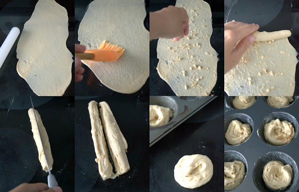 With a sharp knife, cut the roll lengthwise. Shape them in a roll form and place them in the muffin mold, previously greases with some butter. Repeat until finish all the dough.