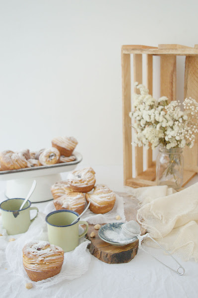 Los míos llevan solo un toque diferente a los de Sandra porque en casa somos más de chocolate que de crema pastelera, y le he añadido unas avellanas para darle una textura crujiente a la masa. Por lo demás, no he cambiado nada. Están tan cual y tan ricos, que seguro que me animo a hacerlos otra vez. Vamos a ver la receta y el paso a paso.