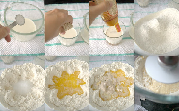 Warm milk and separate into 2 bowls. Dissolve salt in one of them and honey and yeast in the other. Let stay for 5 minutes.