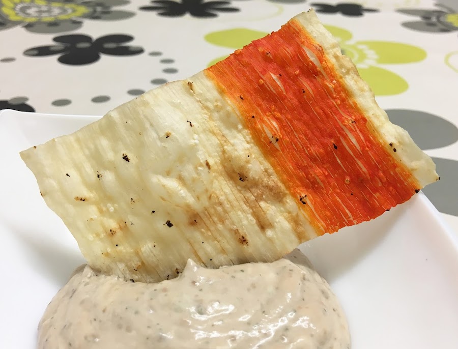 - Cuando todos los ingredientes se hayan batido y mezclado bien, lo servimos en un bol pequeño con los crujientes de surimi al lado.