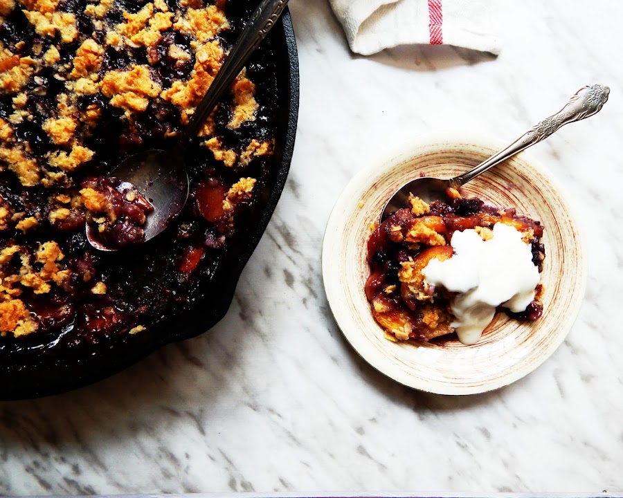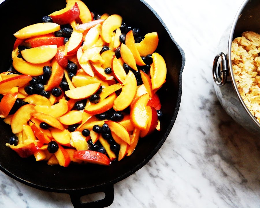 Para este crumble, nuestra receta de hoy, decidí utilizar nectarinas y duraznos y como toque le puso unos cuantos blueberries que me habían quedado en el refri y ya estaban esperando ser usados.