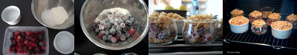 Sacar la masa de la nevera y con un rallador grueso hacer pequeños trozos. Poner un poco en la base de los moldes que vayamos a utilizar, con estas cantidades nos ha dado para 6 raciones individuales. Colocar a continuación los frutos rojos y cubrir con el resto de la masa.