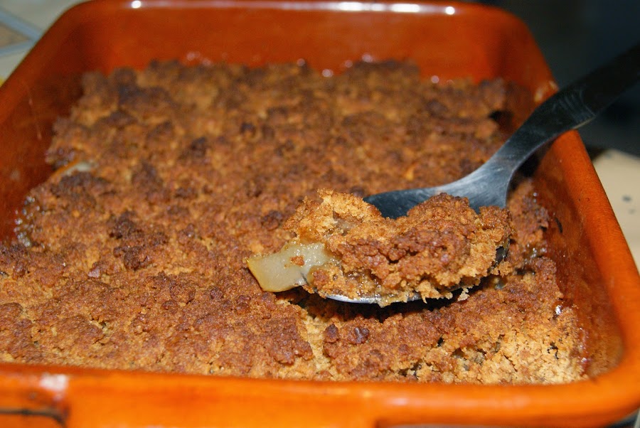 Precalentamos el horno a 150º C. Trituramos las galletas con la ayuda de un rodillo hasta que queden finas. Picamos la fruta en trozos muy pequeños y la colocamos en una bandeja de horno cubierta con el azúcar. Mezclamos las migas de galleta con la mantequilla cortada en daditos y lo amasamos hasta que obtenemos una pasta con aspecto de migas. Ponemos las migas sobre la fruta y metemos al horno unos 35 minutos. Se puede degustar tanto frío como caliente.