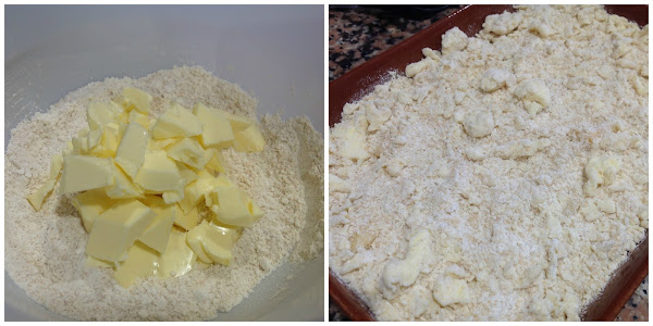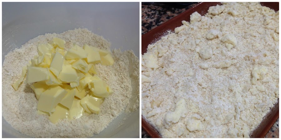 En un bol mezclamos la harina con el azúcar moreno, añadimos la mantequilla troceada y la desmigamos. Cubrimos con esto el relleno y cocinamos en el horno a 180º durante 30 minutos o hasta que se dore bien.