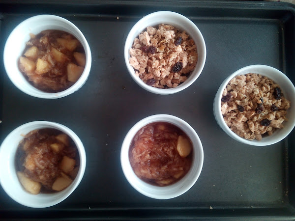 En un recipiente apto para hornear o varios individuales, colocamos el relleno, el cuál iremos cubriendo con el topping y agregamos unas cuantas pasas por encima.