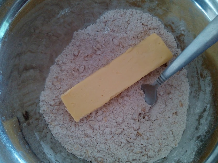 En otro recipiente mezclamos harina, azúcar, canela, avena y margarina. Con la ayuda de un tenemos comenzamos a deshacer e integrar la margarina con el resto de ingredientes.