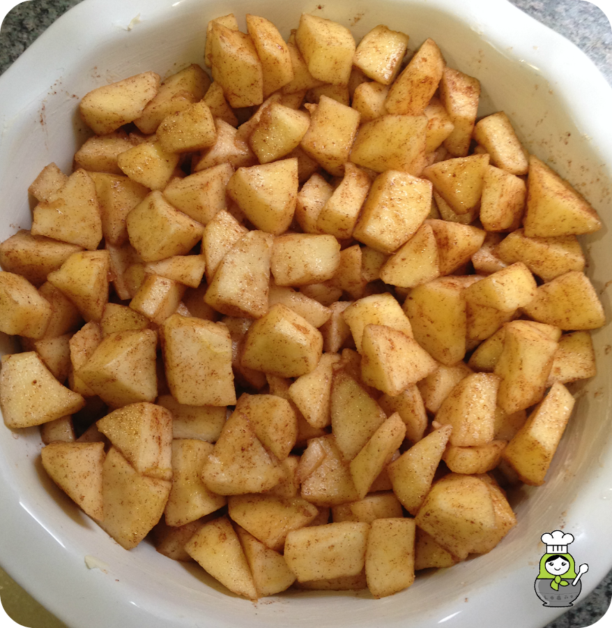 Precalentamos el horno a 180ºC. Pelamos las manzanas y las cortamos en dados. Las mezclamos con la canela, el limón y 2 cucharadas de azúcar. Revolvemos todo bien con cuidado para no destrozar la manzana. Untamos con mantequilla un molde de cerámica o cristal apto para el horno y colocamos en él la manzana.