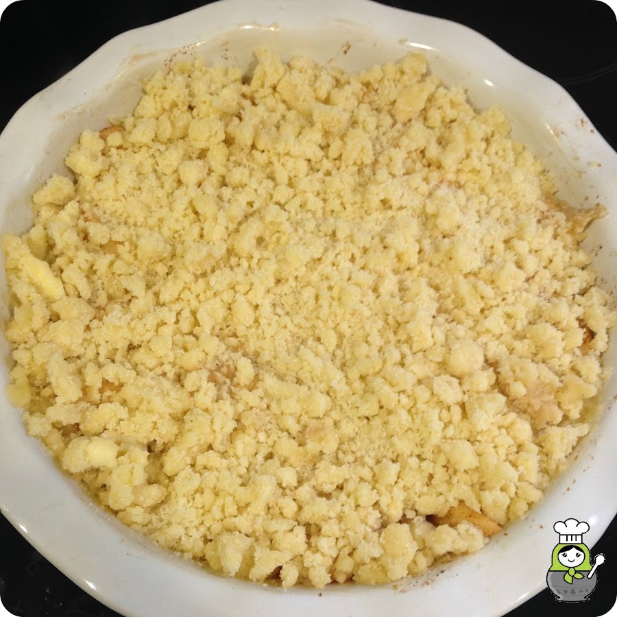 Echamos la pasta arenosa sobre las manzanas hasta cubrir el molde y horneamos hasta que se dore bien la pasta, unos 30 minutos aproximadamente.