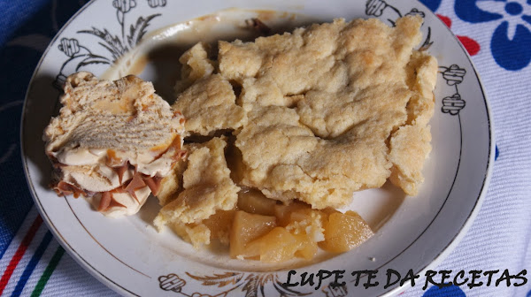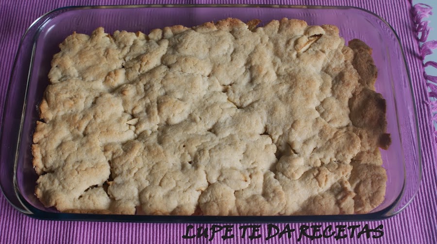 Pelar las manzanas, cortar en trozos pequeños y mezclar con los 15gr. de azúcar y la canela y colocar en una fuente de horno engrasada previamente, las medidas de la fuente serán más o menos de 20x30. Colocar la masa desmigada por encima, cubriendo todas las manzanas.