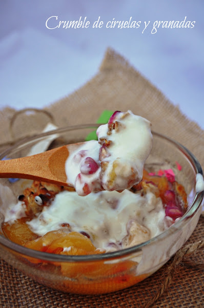 En un bol ponemos las ciruelas. Añadimos los granos de la granada y encima el crumble.