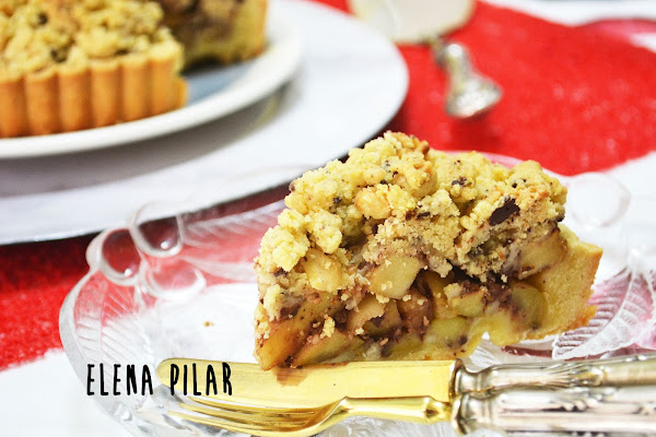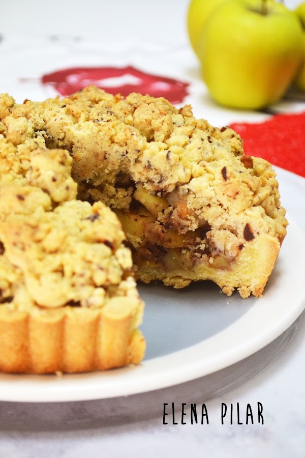 He tardado un poco, lo sé. A lo largo de este tiempo, entre cursos varios de repostería y la puesta en marcha de un proyecto muy guay, apenas he podido sacar algún ratillo para dedicarme a elaborar recetas para el blog. Pero nunca es tarde, si la receta es tan mega buena como esta. Una tartaleta rellena de manzana, avellanas, ralladura de naranja y pedacitos de chocolate cubierta por un mega crumble descomunal de, igualmente, avellanas, naranja y más trocitos de chocolate.