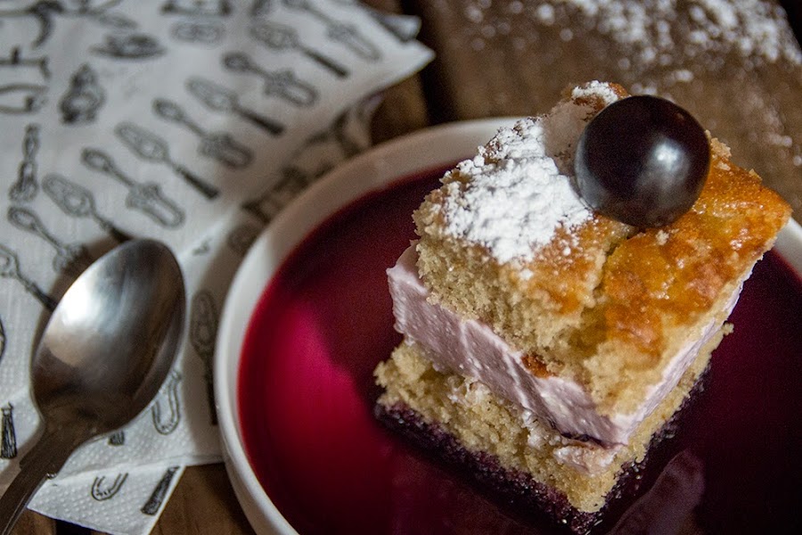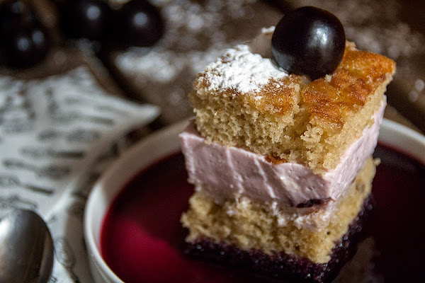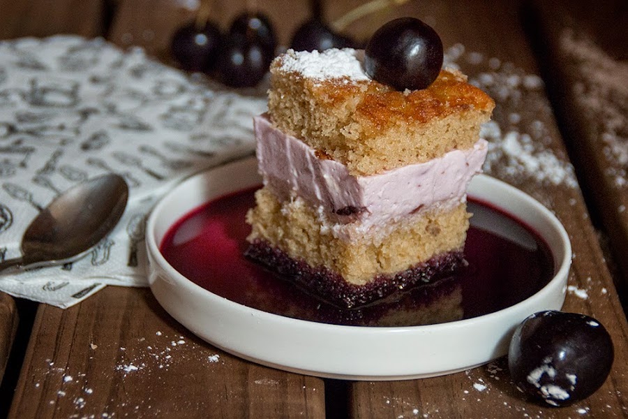 Sacamos, tapamos con la otra mitad del bizcocho también untada con un poco de almíbar y desmoldamos con cuidado antes de cortar en cuadrados que serviremos con un poco de zumo de cereza y azúcar glass por encima.