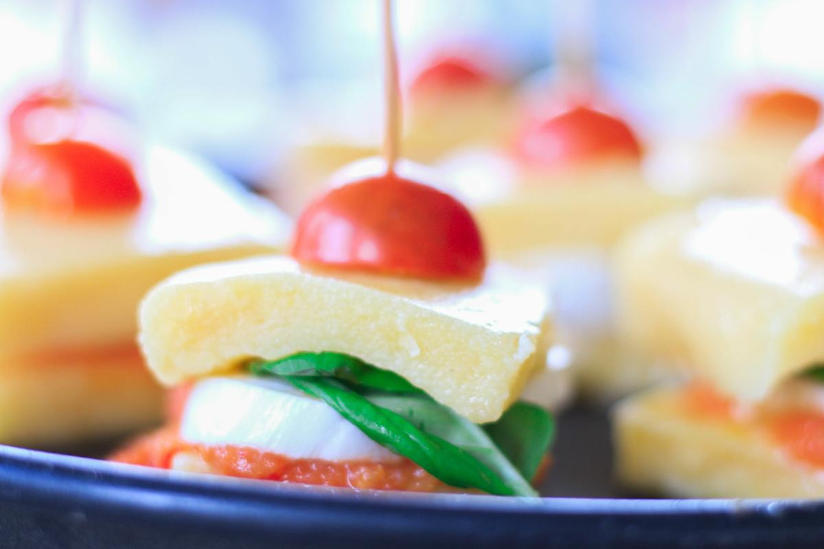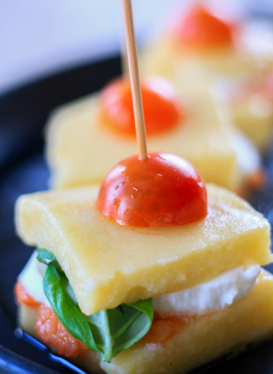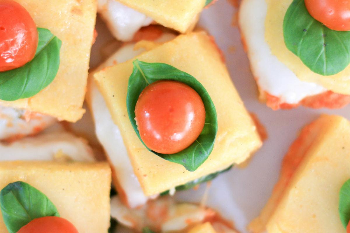 Cuadraditos de polenta con mozzarella, tomate y albahaca, ideales para acompañar con una ensalada o como entrada.