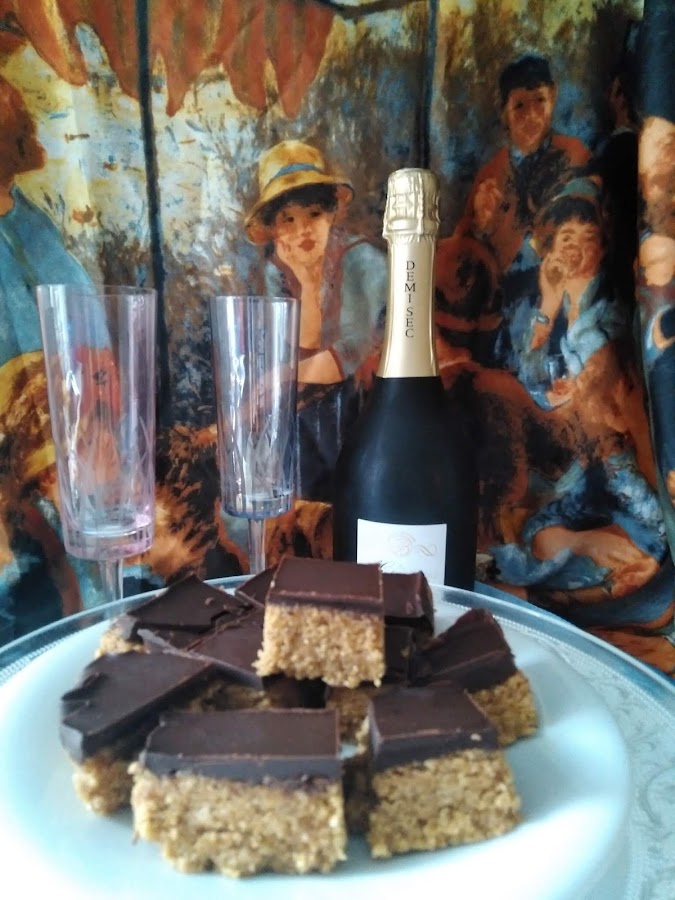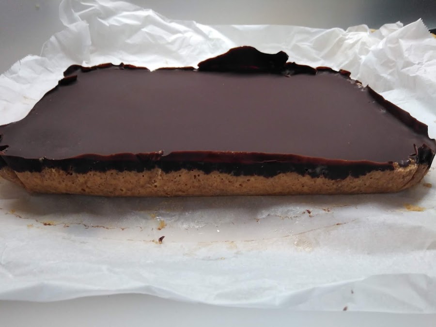 Vertemos la mezcla en el molde forrado y presionamos bien con el dorso de una cuchara. Tiene que quedar una capa compacta y apretada. Extendemos por encima el chocolate derretido, inclinando el molde a uno y otro lado para que todo quede cubierto uniformemente. Ponemos en el congelador 30 minutos para que adquiera consistencia. O en la nevera 1 hora.