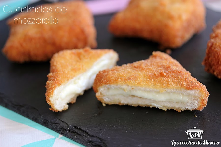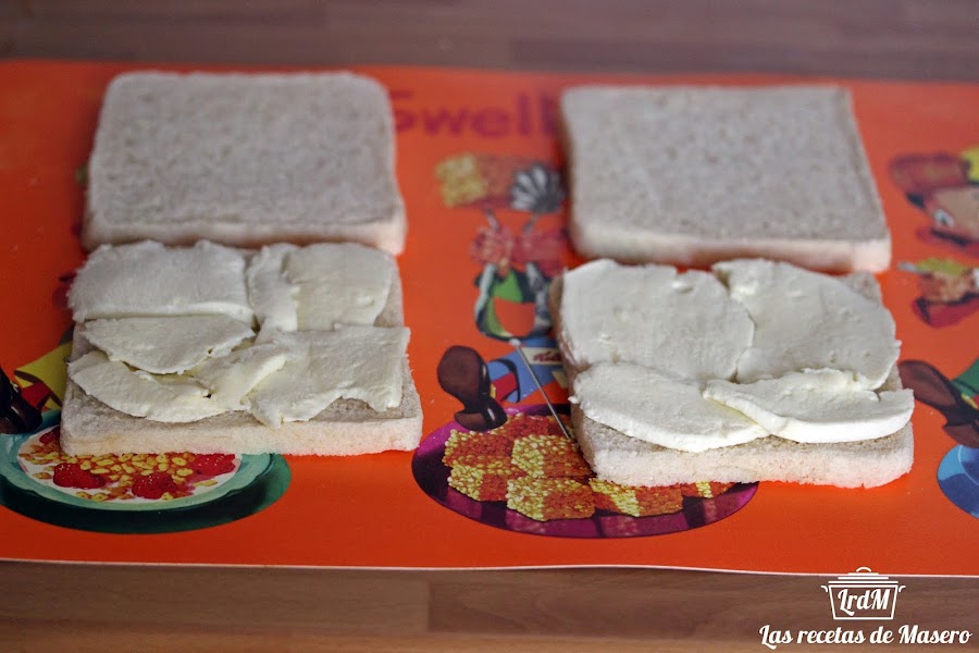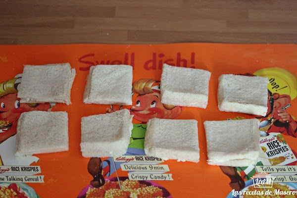 Poner sobre las rebanadas de pan, la mozarella como se ve en la fotografía, salamos al gusto , cubrimos con otra rebanada de pan y las cortamos en cuatro cuadrados. La mozzarella no debe de sobresalir del pan , para evitar que se salga cuando las pasemos por la sartén.