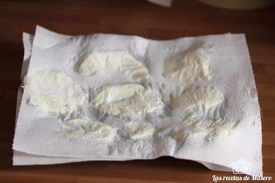 En primer lugar cortamos la mozzarella en rodajas de 1cm de espesor, las colocamos sobre un plato forrado con papel absorbente y las cubrimos con otra hoja de papel absorbente, presionando con las manos para quitarle el exceso de agua.Si es necesario cambiamos las hojas de papel hasta que la mozzarella esté totalmente seca.