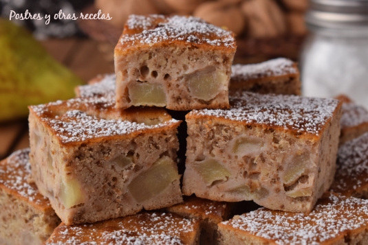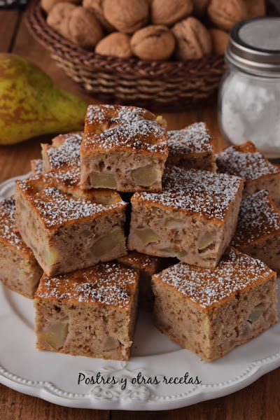 Un delicioso dulce de pera, miel y nueces, muy muy fácil. Esponjoso y jugoso con una miga llena de pequeños trocitos de nueces picadas. Realmente delicioso, si no lo habéis probado.... ¿a qué estáis esperando?.
