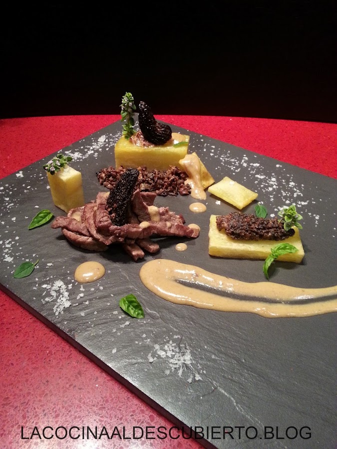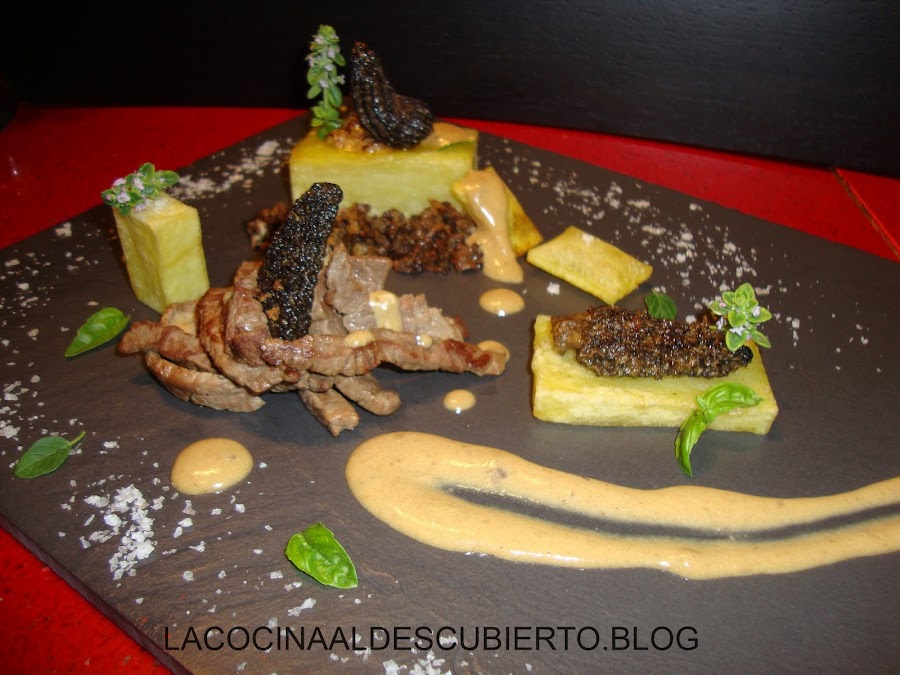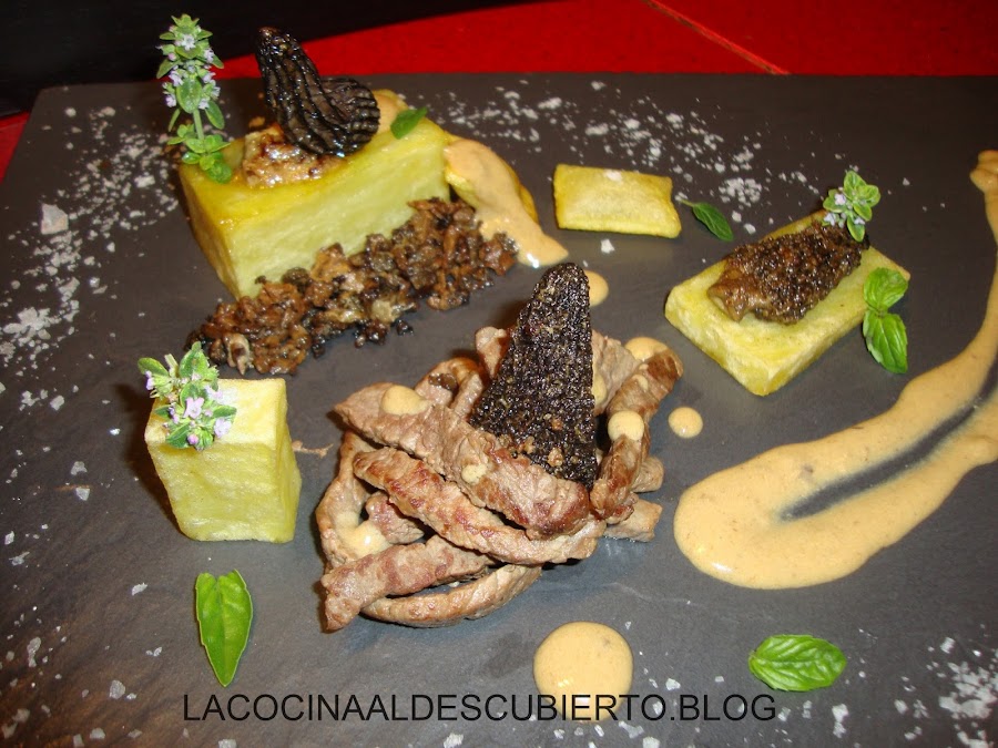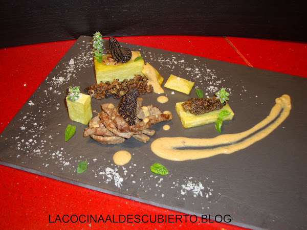 PATATA SUFLE Y CONFITADAS, MONTAÑA DE TERNERA, COLMENILLAS RELLENAS DE FOIE Y SU SALSA
