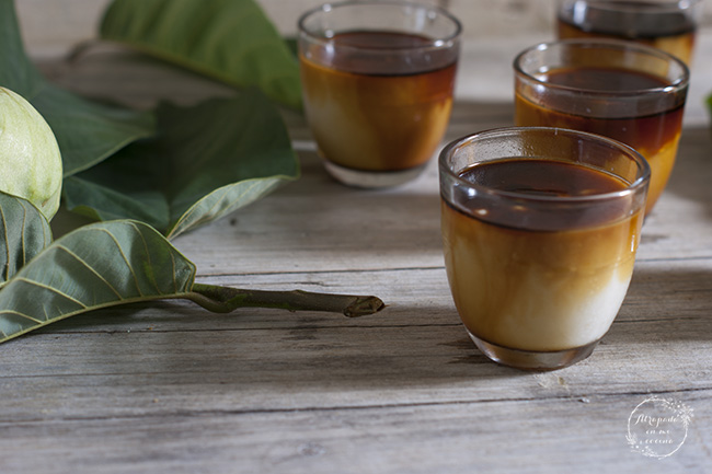 Vertemos la mezcla en vasitos y dejamos enfriar a temperatura ambiente. Después pasamos al frigorífico tapados y dejamos enfriar para que termine de cuajar.