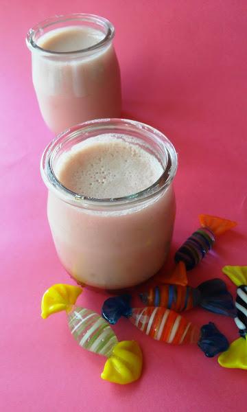 Pon en los vasitos (son reciclados de los de yogurt comprados) unas cucharadas de mermelada de fresas y cubre con la cuajada.