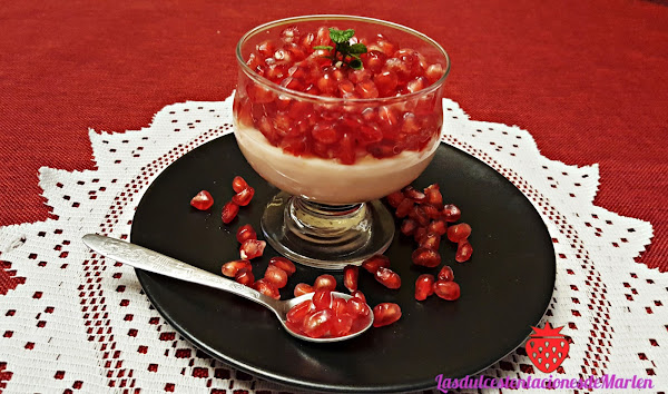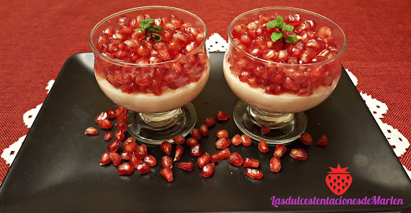 Sacamos los vasitos del frigo y ponemos la granada sobre la cuajada en el momento de servirla. Decoramos con unas hojitas de menta.
