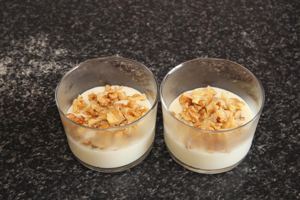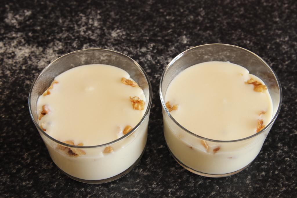 Añadimos la mezcla de la leche y la cuajada, mezclamos bien y dejamos a fuego medio/suave hasta que rompa a hervir sin dejar de remover. Retiramos del fuego y vamos rellenando los moldes hasta la mitad con la crema, añadimos las nueces troceadas y terminamos con crema. Una vez fría llevamos a la nevera.