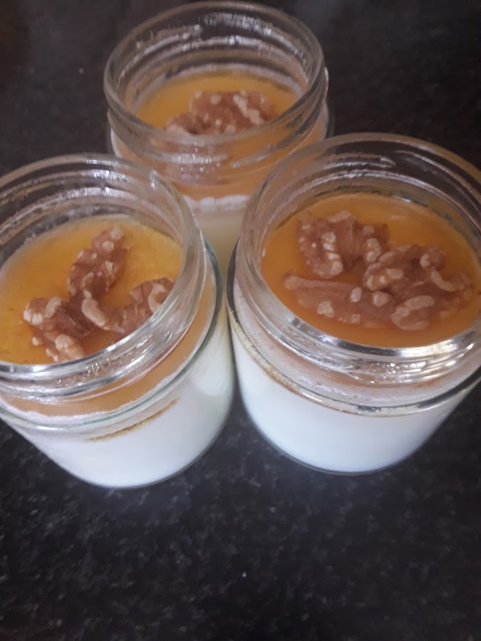 La otra opcion es en vasitos de cristal y yevar nevera cuaje unas horas acompañr de miel y nueces.
