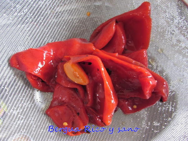 1. Escurrimos los pimientos. Podemos desechar el líquido o guardarlo si queremos usarlo para alguna otra receta.