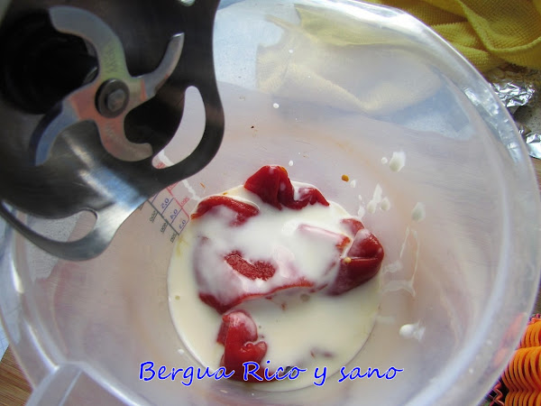 2. Batimos a máquina el diente de ajo, los pimientos y la nata (crema de leche).