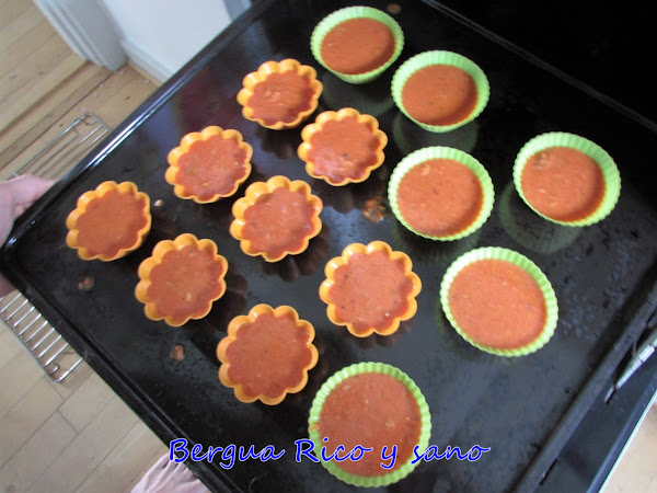 5. Toca rellenar los moldes. Si son de silicona, no es preciso prepararlos; si son metálicos, los engrasamos ligeramente con aceite por dentro, por los lados y la base. Con una cuchara vamos rellenándolos con nuestra mezcla. No los llené hasta arriba por miedo a que subieran y se desbordaran, pero se desinflan al sacarlos del horno, así que no tengáis miedo de llenar los moldes casi hasta arriba.