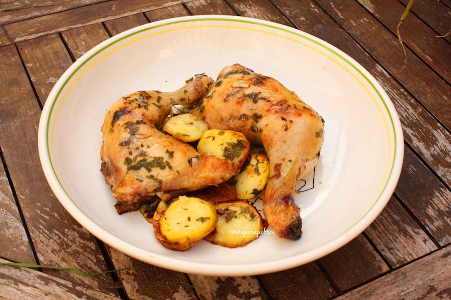 Una vez el pollo tengo color tostado, aproximadamente a los 25 minutos, le damos la vuelta y dejamos hasta que tome también color.