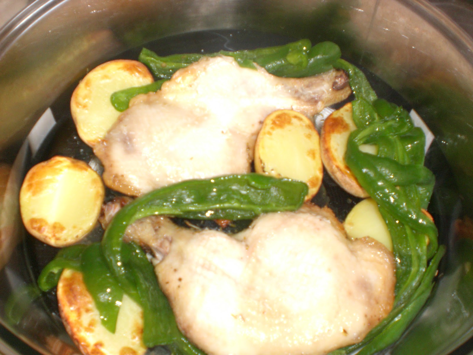 Esto es lo que hemos comido hoy; unos cuartos de pollo hechos 100% sanos sin aceites y una guarnición sencilla de patata y pimiento verde.