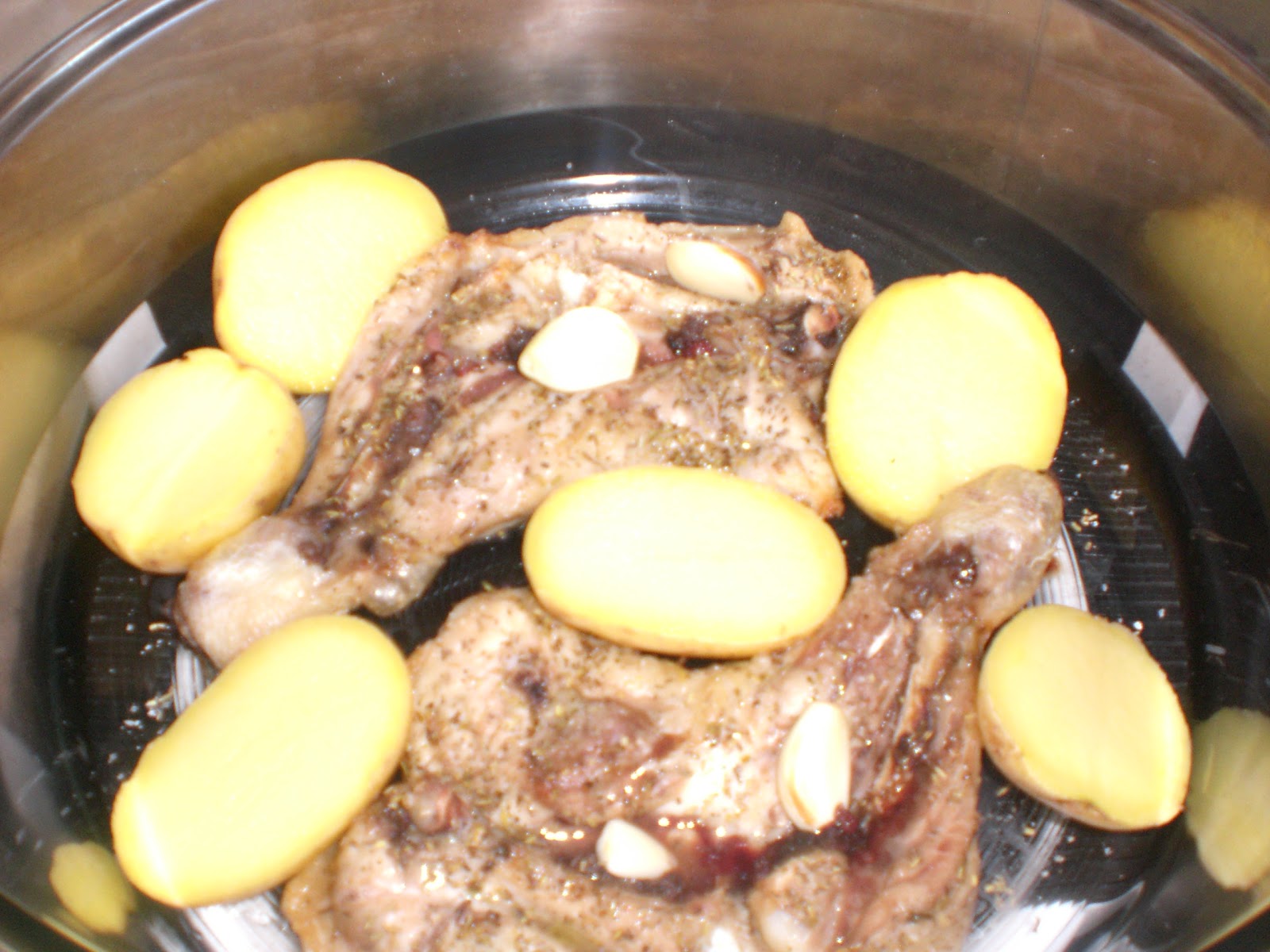 En el fondo del pirex del HTC, colocaremos los cuartos de pollo salados y condimentados con el romero. Les dejaremos caer los ajos peladosy enteros