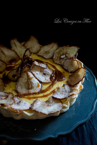 5. Retirar la tarta de la nevera. adornar con las peras caramelizadas y salsear al gusto con toffe a la sal , o una salsa de caramelo, o dulce de leche.