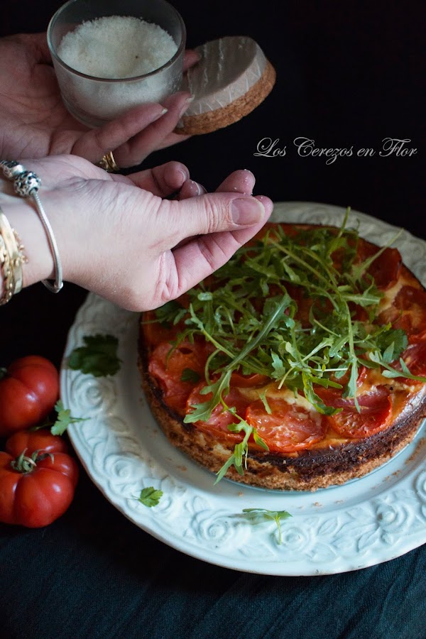 4. Verter la mezcla de quesos y huevos sobre la base previamente horneada y ya templada. Sumergir en la crema de queso los tomates envueltos con la anchoa. Hornear a 150°C durante 30 minutos.