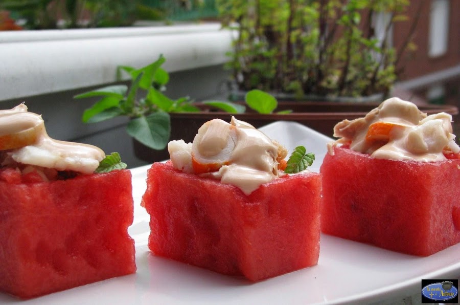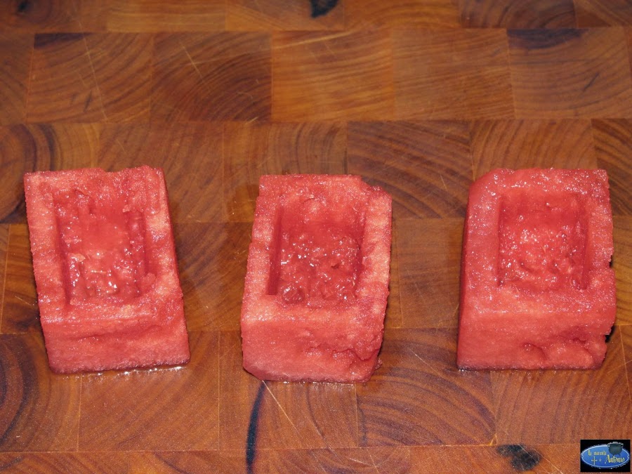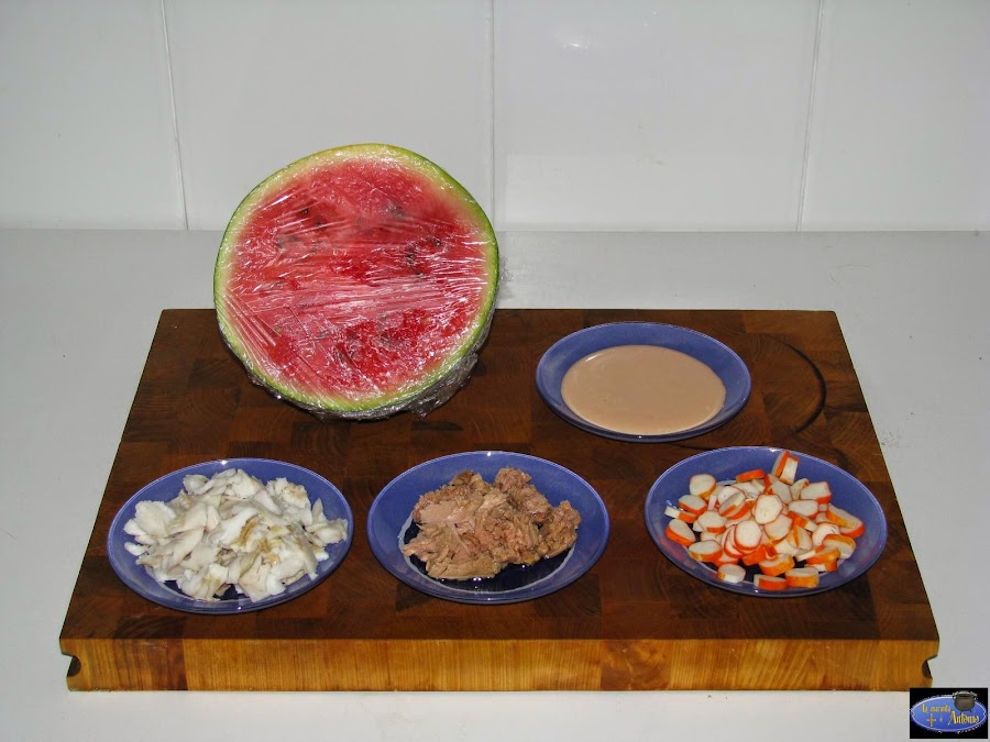 Para ir terminando el verano vamos a disfrutar de una de las frutas que reinan en esta época del año...la sandía. Un aperitivo rápido de preparar y muy refrescante. Lo único malo es que hay que tener un poco de paciencia para ir quitando las pepitas pero bueno tampoco es para tanto. En este caso vamos a rellenar los cubiletes con un poco de pescado pero yo creo que admite un montón de rellenos... eso sí fríos mejor.