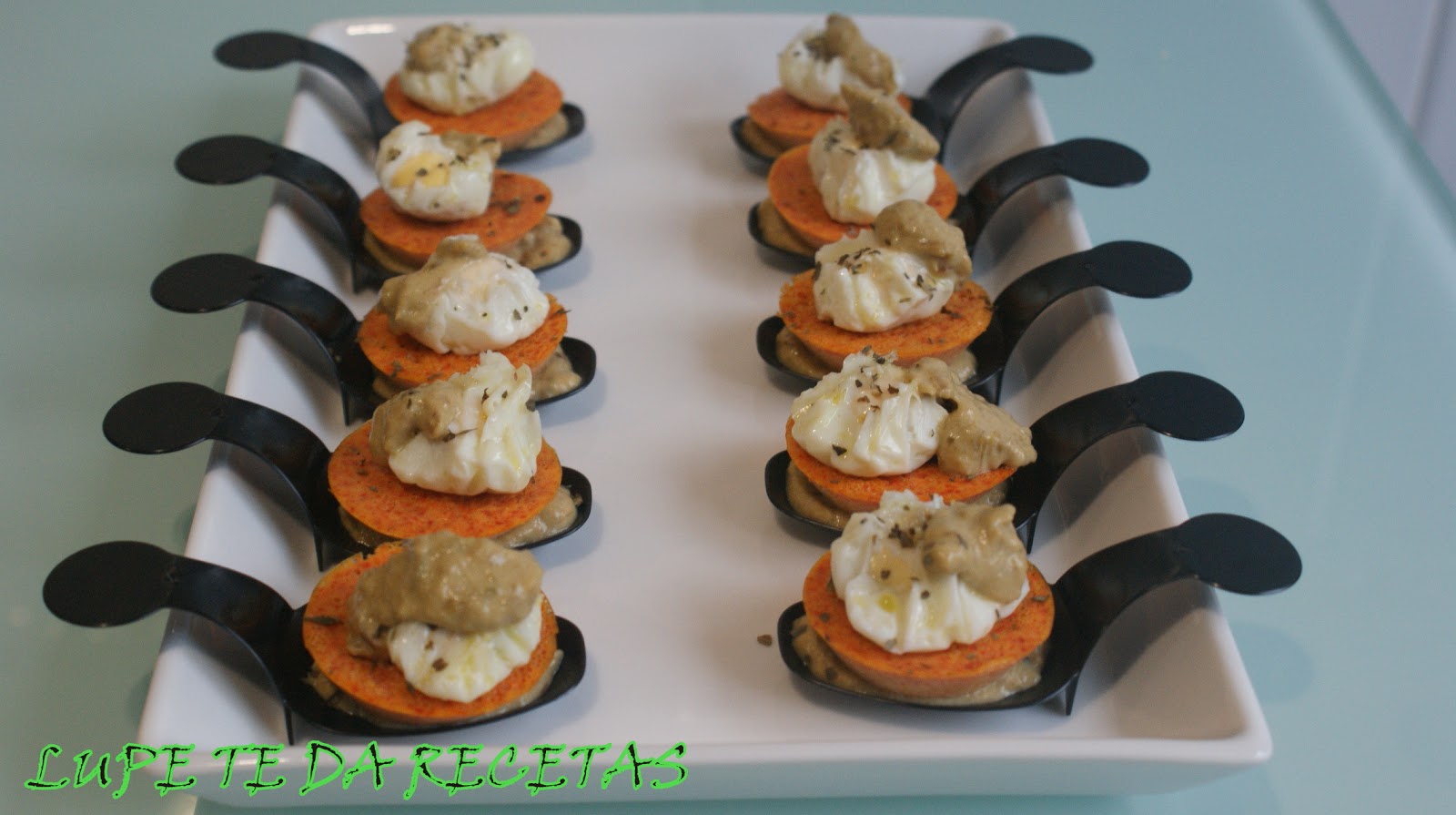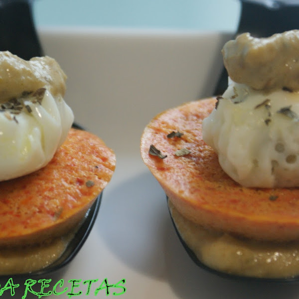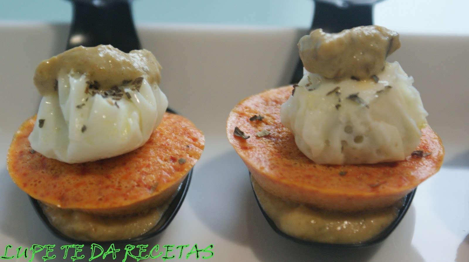 Montar: En cada cuchara poner un flan de piquillos tapar con un huevo escalfado y por último napar con la salsa de pimiento verde. Tomar caliente o templado.