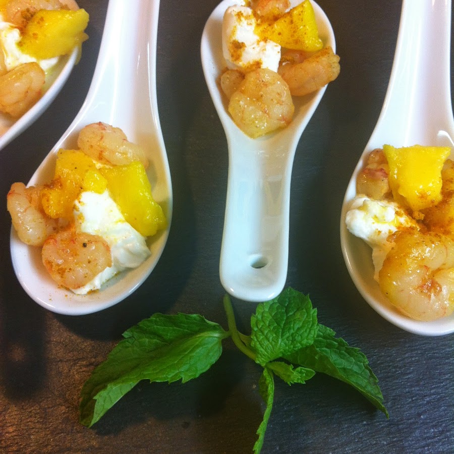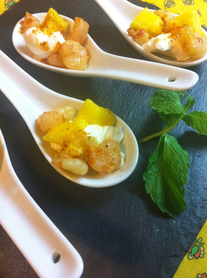 Se pela el mango y se corta en trocitos o dados. Se van disponiendo en cada cucharita un poco de queso fresco, se colocan 2 o 3 gambas y un par de trocitos de mango. Se espolvorea con un poco de curry en polvo y se sirven inmediatamente.