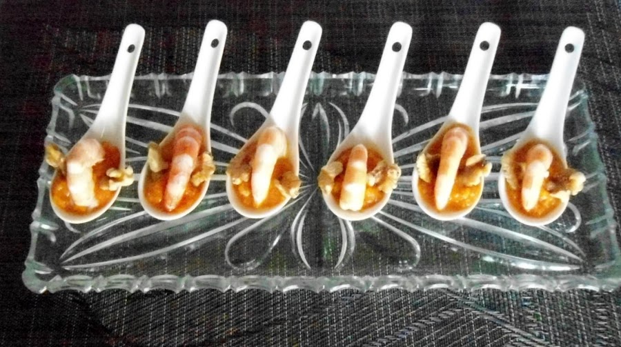 En cada cucharita se pone un poquito de tomate ( o mermelada lo que mas guste) encima el langostino, tenia de los que se compran ya cocidos y las nueces.