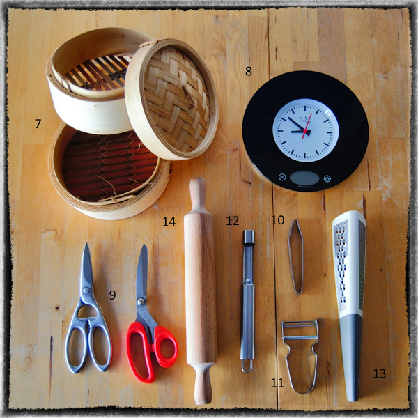 Medir: balanza (8), reloj o timer (aunque el móvil puede hacer las veces de cronómetro) y termómetro.Por último, hay una serie de herramientas básicas indispensables si queremos dar un paso a la hora de cocinar. Tijeras de cocina (9), pinzas para pescado (10), abrelatas, pelador (11), descorazonador (12), rallador (13) y rodillo(14).