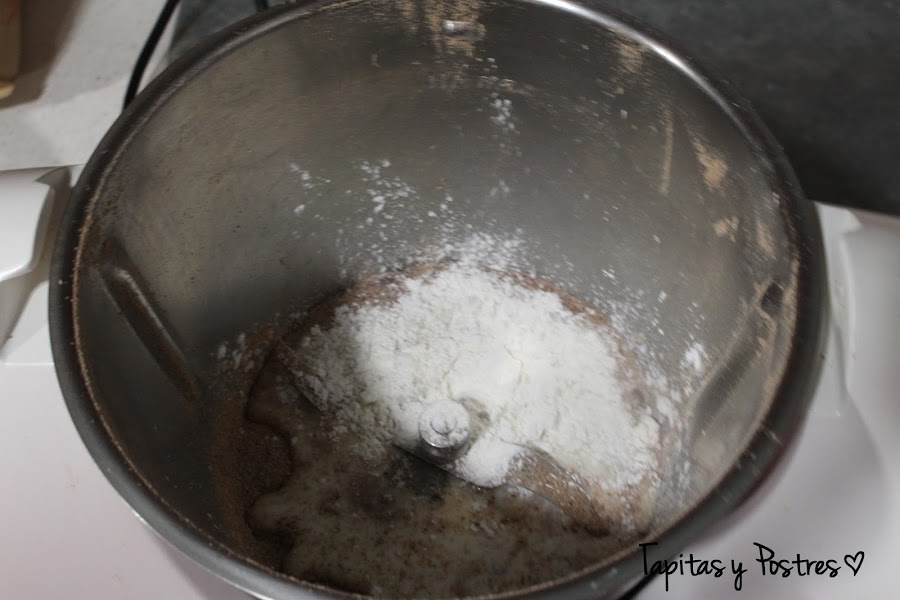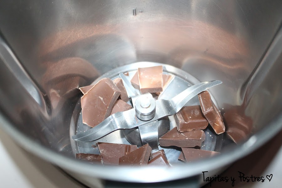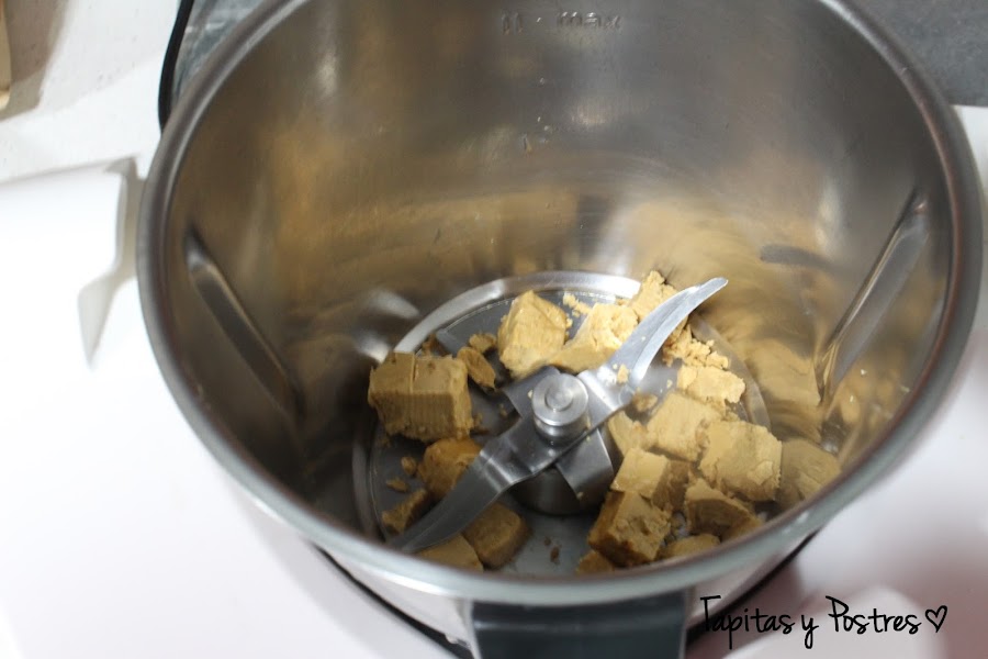 Ahora vamos con la mezcla de turrón, lo troceamos y lo trituramos 5 segundos a velocidad 8-10. bajamos los restos hacia abajo y agregamos el resto de los ingredientes (leche, azúcar, leche evaporada y cuajada), batimos 10 segundos a velocidad 3 y programamos 6 minutos a 90º y velocidad 3. Hacemos lo mismo que con la capa de chocolate, dejamos que se temple y antes de verterlo lo removemos un poquito.