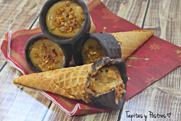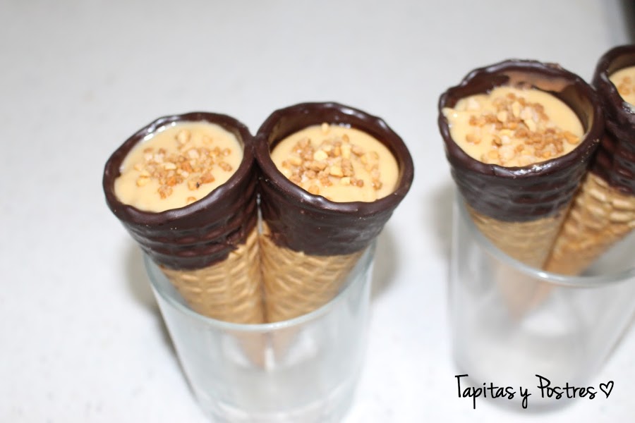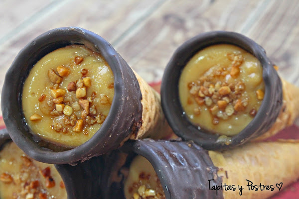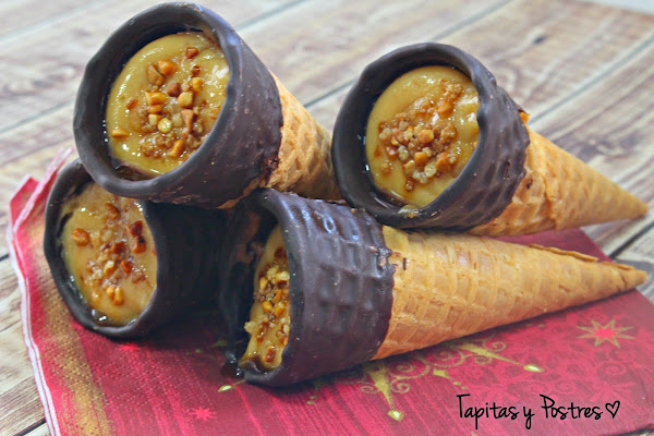 Este postre tiene un inconveniente, la mezcla se deja templar antes de echarla dentro de los cucuruchos pero eso hace que se "ablande" un poco, pero aún así os aseguro que está de muerte.