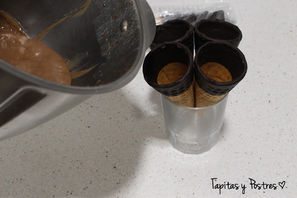 Ponemos los cucuruchos dentro de un vaso para que se mantengan de pie y vertemos la mezcla de chocolate hasta algo mas de la mitad. Los cucuruchos que yo he comprado tienen un borde de chocolate que me ha servido de referencia para echar hasta ahí.