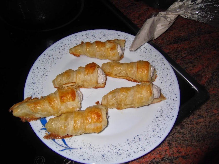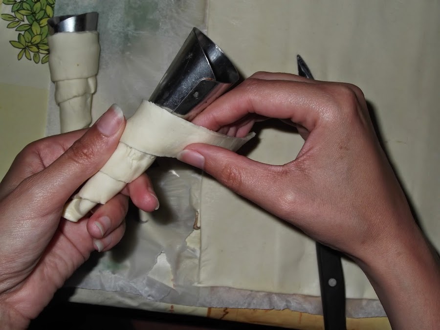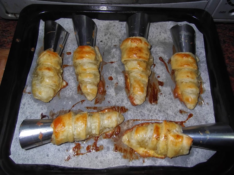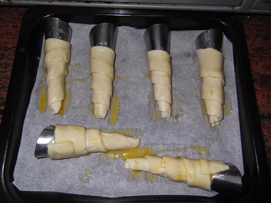 Lo primero que hacemos es estirar la plancha de hojaldre y cortarla de manera vertical. Con estos trozos alargados cogemos los cucuruchos o conos, los encontráis en cualquier tienda de chinos a muy buen precio, y los vais enrollando hasta que tenéis el cucurucho formado. Luego los pintáis con el huevo y los metéis al horno durante 15 minutos a 200º.
